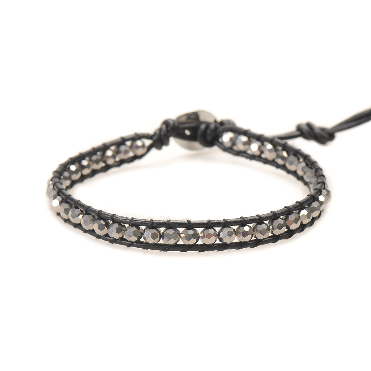 Leather and crystal bead bracelet with 3 different sizes. Embossed with the BQA logo.